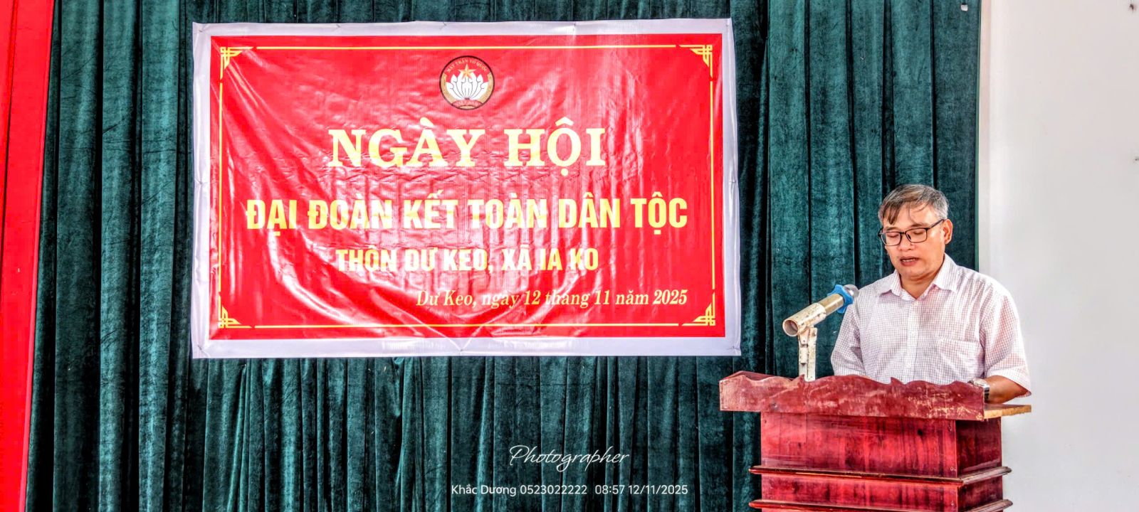 Phát biểu tại Ngày hội, đồng chí Dương Mạnh Mẫn ghi nhận và biểu dương những kết quả nổi bật mà cán bộ, Nhân dân các thôn đã đạt được trong việc củng cố khối đại đoàn kết toàn dân, phát huy dân chủ ở cơ sở và chung sức xây dựng quê hương Ia Ko ngày càng giàu đẹp, văn minh. Thời điểm này là giai đoạn cao điểm thu hoạch cà phê cuối năm và cũng chỉ còn ít tháng nữa là chúng ta bước sang năm mới 2026. Nhân đây, thay mặt Đảng uỷ, HĐND, UBND, UBMTTQ xã xin kính chúc bà con nhân dân Làng Dư Keo một vụ mùa bội thu và năm mới an lành, hạnh phúc, thành công.