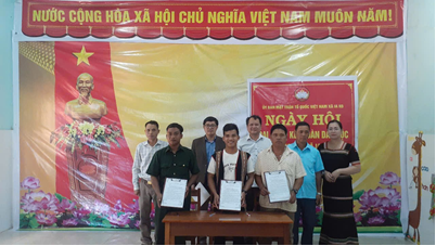 Các đồng chí lãnh đạo xã và Ban công tác mặt trận thôn chứng kiến các hộ dân tham gia ký cam kết giao ước thi đua. Ảnh: HV
