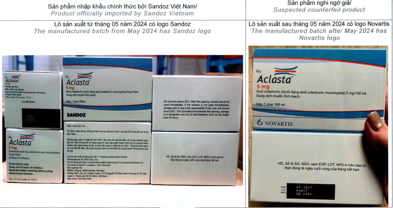 - Không mua, bán hoặc sử dụng thuốc Aclasta có ngày sản xuất từ sau tháng 05/2024 có logo của Novartis (gửi đính kèm tài liệu do Công ty cung cấp về Hình ảnh sản phẩm nhập khẩu chính thức bởi Công ty TNHH Sandoz Việt Nam và sản phẩm nghi ngờ giả).