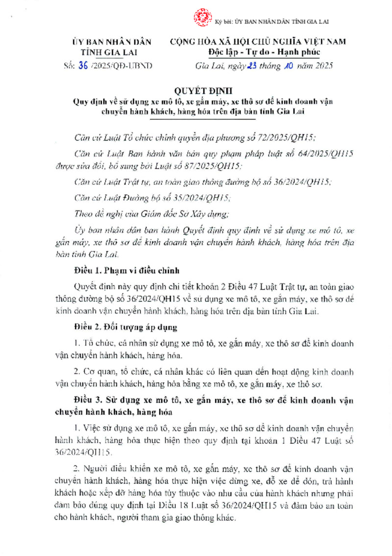 | Tiêu đề văn bản | Quy định về sử dụng xe mô tô, xe gắn máy, xe thô sơ để kinh doanh vận chuyển hành khách, hàng hóa trên địa bàn tỉnh Gia Lai | ||