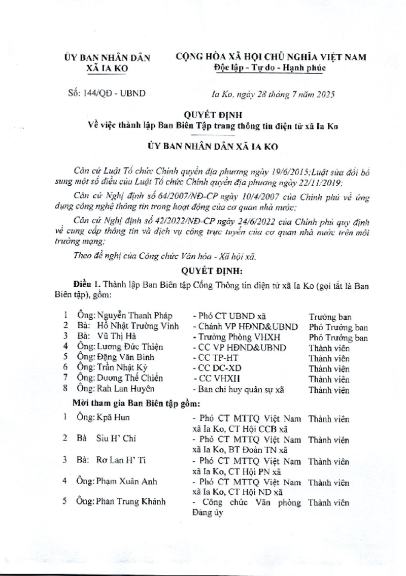 Tiêu đề văn bản | Quyết định thành lập Ban biên tập Website xã Ia Ko | ||